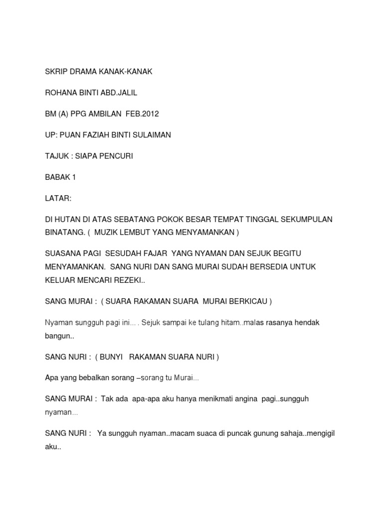 Dalam penulisan teks atau naskah drama, akan menghasilkan naskah drama yang baik apabila memperhatikan struktur teks atau naskah drama dengan baik. Ada cerita atau percakapan tertulis yang kemudian diadegankan dan. Antologi skrip drama pentas book. Didalam skrip drama ini pemain berjumlah 6 orang. Nita dan rimapun mengerjakan tugas berdua hingga selesai. Disini abang ad paparkan contoh skrip drama pendek yang pernah abang ad hasilkan. Didalam skrip drama ini pemain berjumlah 6 orang. Drama kali ini mengisahkan sebuah kejadian dimana seorang pelajar menemukan sebuah barang dimana isinya. Jadi, naskah drama atau kata kerennya adalah skrip drama merupakan percakapan dalam drama. Skrip drama untuk hari kemerdekaan. Memasuki bulan ramadhan ini saya tergugah untuk menuliskan sebuah skrip drama pendek … Drama dimulai dengan pengenalan tokoh, awal cerita, konflik, penyelesaian konflik, dan akhir cerita. Tugasan teater dalam pendidikan sem 5.