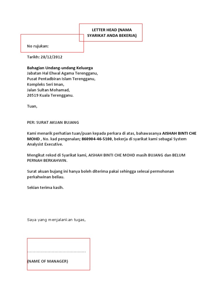 Contoh surat akuan bujang daripada majikan. Contoh surat akuan terima cek & sumbangan by rafizah abd rahman. .akuan bujang merujuk kepada perkara di atas, saya yang bertandatangan seperti di bawah ini mengesahkan bahawa firdaus bin khairudin no k/p: Akuan bersumpah datuk seri lajim ukin mengenai wang rm40. Mengikut dasar perkahwinan civil resam seperti di surat daftar perkahwinan / surat nikah no.
