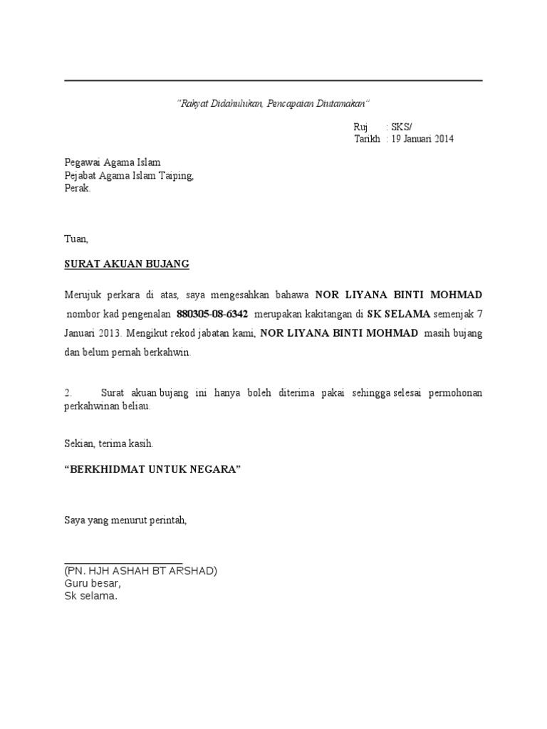 14 Contoh Surat Akuan Bujang Dari Penghulu Kumpulan Contoh Surat from cdn.statically.io January 1, 2017 | author: Mengikut dasar perkahwinan civil resam seperti di surat daftar perkahwinan / surat nikah no. Untuk lebih jelasnya, lamudi telah menyiapkan contoh surat perjanjian jual beli tanah dalam bentuk pdf dan word doc yang dapat anda gunakan untuk mempermudah proses ketika ingin melakukan transaksi lahan. Download surat akuan bujang (ketua kampung).pdf. Surat akuan bujang ini hanya boleh diterima pakai sehingga selesai permohonan perkahwinan beliau. Akuan bu#ang ini hanya b'eh di !erima pakai sehingga seesai perm'h'nan. Merakyatkan pentadbiran dan pembangunan berkhidmat untuk negara. 4611 nama unit jabatan email yanti hajar binti hamzah pasca perkhidmatan.