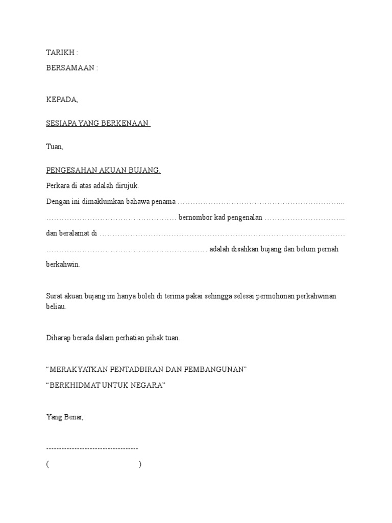Related : Surat Akuan Bujang Pdf : Surat akuan bujang ini hanya boleh diterima pakai sehingga selesai permohonan perkahwinan beliau..