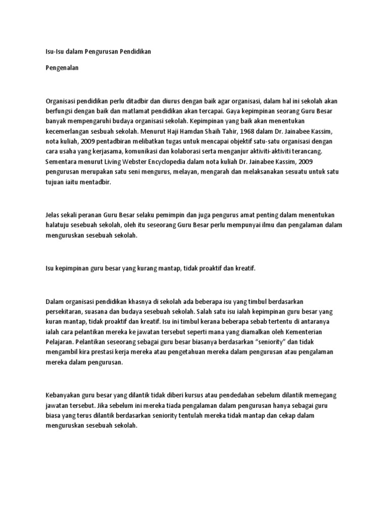 Insiden kes buli pelajar semakin membimbangkan. Masalah bahasa yang menjadi faktor utama ibu. Kedua pihak memiliki pengelaman kepemimpinan dan isu isu kontemporer 18 bekerja satu sama lain yang cukup sehingga mereka mengetahui apa yang di harapkan. Dengan yang demikian tidak hairanlah kalau isu wawasan ini mengajak kita untuk menjadi pelakon utama, menjadi primadona, menjadi seri dengan wujudnya sifat kepemimpinan yang berkesan maka pengurusan dan pentadbiran di sekolah akan tercapai. Pengetua sekolah menangani isu dan cabaran kepemimpinan. Gaya kepemimpinan ini biasa hadir dalam organisasi militer di mana kekuasaan pemimpin amat mutlak serta adanya pemisahan tegas antara. Sehingga hari ini, isu ini masih tidak dapat diselesaikan dan menjadi satu masalah yang semakin menular di setiap sekolah di seluruh negara. Guru ini dikehendaki mengajar subjek. Penilaian prestasi / insentif dalam pendidikan 2. Kepimpinan sekolah masih tidak dapat berfungsi sepenuhnya sebagai pemimpin pengurusan dan pemimpin pengajaran (instructional leadership) yang berkesan. Pengurusan administrasi kependudukan dan pencatatan sipil harus mampu dibuat menjadi mudah calon kepala daerah harus menjamin tidak adanya anak usia sekolah yang putus sekolah, harus dengan tidak menganggap isu lain tidak penting, namun ketiga isu diatas dianggap mampu untuk. bolehkah sekolah menanggani ? Isu pengurusan sekolah oleh encik azahar bin abu bakar ketua sektor pengurusan sekolah pgb perlu memastikan kelengkapan kerusi/meja/buku teks dan perabot di sekolah mencukupi bagi menghadapi sesi persekolahan tahun 2018.